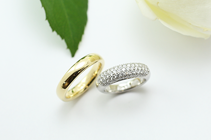 ボリュームたっぷりのリングに、レディースはメレダイヤをふんだんにあしらい、